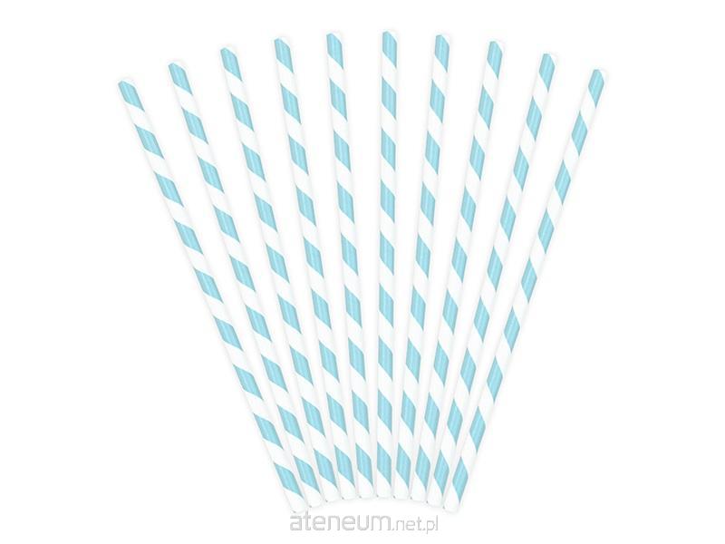 Słomki papierowe w kolorze błękitnym z białymi ukośnymi paskami, długość około 19,5 centymetra.(1 op. / 10 szt.)