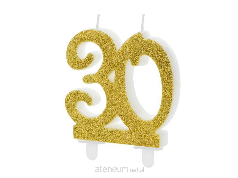 Świeczka urodzinowa liczba 30 w kolorze złotym brokatowym, rozmiar ok. 7.5 cm.