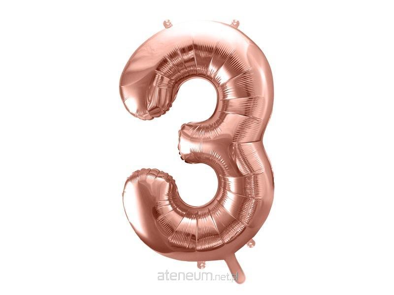 Balon foliowy metalizowany Cyfra ''3'' w kolorze różowego złota, rozmiar przed napompowaniem ok. 100 cm (39''), rozmiar po napompowaniu ok. 86 cm (34''). Do napomowania powietrzem i helem.