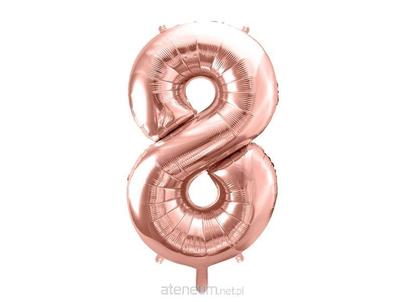 Balon foliowy metalizowany Cyfra ''8'' w kolorze różowego złota, rozmiar przed napompowaniem ok. 100 cm (39''), rozmiar po napompowaniu ok. 86 cm (34''). Do napomowania powietrzem i helem.