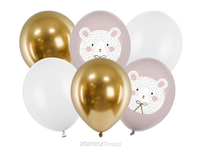 Balony Strong Miś Polarny z nadrukami, zestaw zawiera 6 balonów ( 2 pastelowe w kolorze Warm Grey z kolorowym nadrukiem, 2 pastelowe w kolorze Pure White i 2 Glossy w kolorze złotym), średnica ok. 30 cm.(1 op. / 6 szt.)
