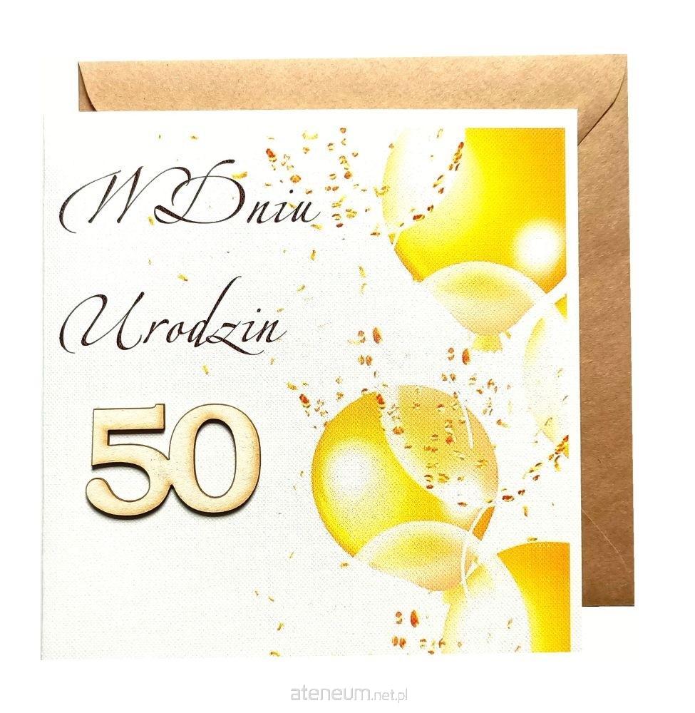 Kartka okolicznościowa z okazji urodzin o treści: Pół wieku już na świecie spędziłeś, I wiele szaleństw w tym czasie przeżyłeś. Pamiętaj, w życiu nie ma czego żałować, A urodziny trzeba hucznie świętować, I tak też dzisiaj zaraz zrobimy, Wzniesiemy toast, życzenia złożymy. Niech uśmiech na Twojej twarzy zagości, Bo dom Twój pełen będzie dziś gości!