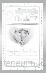 Kartka okolicznościowa z okazji Chrztu Świętego o treści: Bądź pozdrowiona dziecino w tym Dniu uroczystym, niech Twoje serce pozostanie pięknym i czystym. Oby życie Twe w szczęśliwości upłynęło, bo tak się pięknie zaczęło! Niechaj Chrzest Święty Cię mocą obdarzy i nic złego Ci się nie przydarzy! Patrz z nadzieją na całe swe życie, żyj w radości i dobrobycie!
