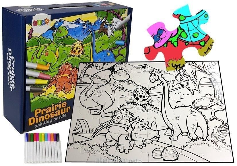 Puzzle Do Kolorowania Dinozaury Pisaki 24 elem Puzzle ćwiczą cierpliwość, precyzję i pozwalają na skoncentrowanie się na danej czynności. Dodatkowo mamy teraz opcje artystyczną, Twoje dziecko będzie mogło pomalować puzzle na dowolne kolory, wyrażając przy tym siebie. Zestaw składa się z 24 puzzli oraz 12 różnokolorowych pisaków, którymi dziecko może pomalować. Obrazek przedstawia dinozaury i środowisko, w którym żyły. Na białym tle jedynie zaznaczone są czarne kontury. Będzie mógł poznać wygląd i otoczenie tych prehistorycznych zwierząt. Poszerzy przy tym swoją wiedzę, a podczas układania rozwinie swoje zdolności manualne. Idealna forma spędzania wolnego czasu, która niesie za sobą wiele korzyści i zabawy. Wymiary jednego elementu: około 20 cm x 21 cm Wymiary złożonego obrazka: 92 cm x 62 cm Wymiary opakowania: 28,5 cm x 24 cm x 9 cm Przeznaczony dla dzieci w wieku powyżej 4 roku życia. Zabawka jest zgodna z norma EN71