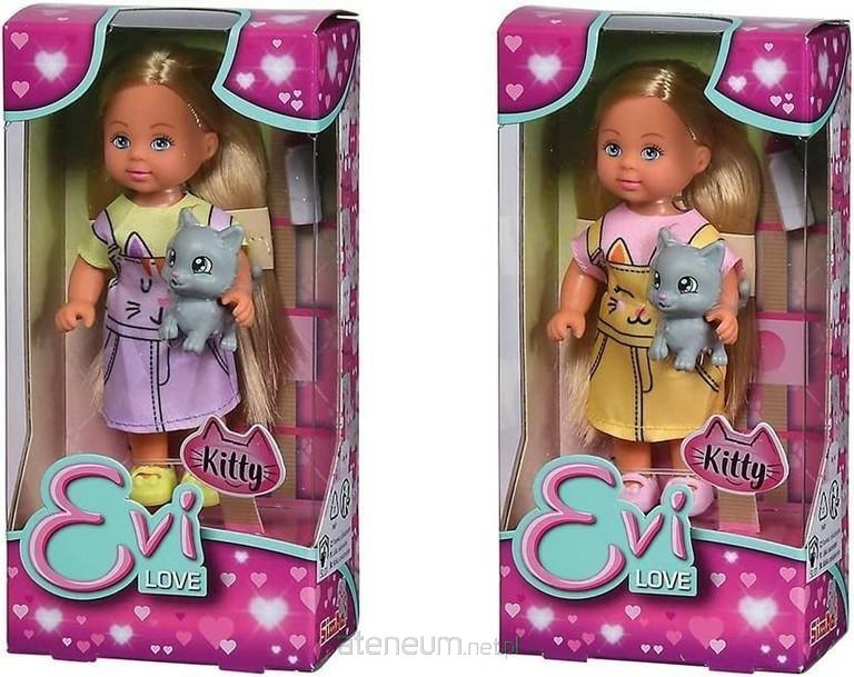 Evi w sukience, z figurką kotka i butelką do karmienia. Wysokość: 12 cm