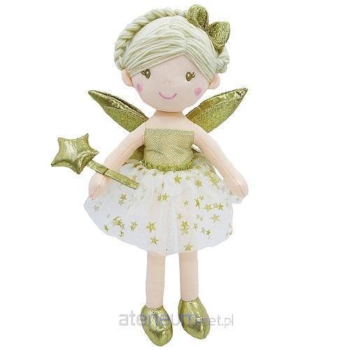 Urocza lalka, wykonana z materiału przyjemnego w dotyku, doskonała jako przytulanka. Lalka ma kucyk wełnianych włosów w kolorze beżowym, brązowe, wyszywane oczy i uśmiech na buzi. Ubrana jest w błyszczącą, złotą sukienkę z tiulową spódnicą w kolorze białym. Na plecach ma złote, brokatowe skrzydełka i brokatową różdżkę-gwiazdkę w dłoni w tym samym kolorze. Lalka wykonana z dobrej jakości materiałów,starannie i precyzyjnie. Lalka bez dźwięku.