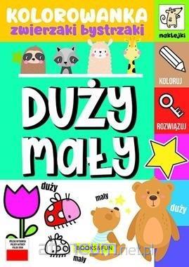 Zwierzaki bystrzaki. Duży mały to kolorowanka, w której dzieci mogą poćwiczyć rozpoznawanie i opisywanie wielkości przedmiotów oraz porządkowanie ich zgodnie z rozmiarem. Rozwiązując proste zadania, kolorując obrazki i naklejając naklejki, będą się uczyć i bawić.