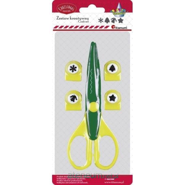 Zestaw nożyczki dekoracyjne (wzór zygzak) + 4 dziurkacze z motywem 10mm: dzwonek, płatek śniegu, gwiazdka, choinka