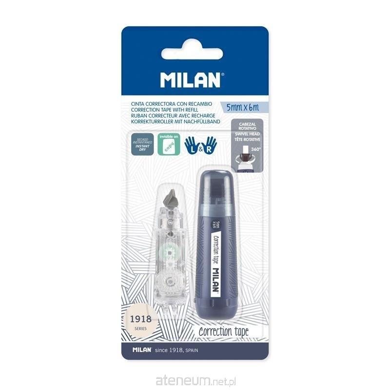 Cylindryczna taśma korekcyjna z serii 1918 w kolorze granatowym. Odpowiedni dla osób leworęcznych dzięki obrotowi końcówki o 360 stopni. Szybko, czysto i precyzyjnie. Korekty na wszystkich rodzajach papieru, nie pozostawia śladów na kserokopii lub faksie. 5 mm szerokości x 6 m długości. W zestawie wkład taśmy. Seria 1918 jest inspirowana oryginalnymi kolorami i wzornictwem gumek MILAN.