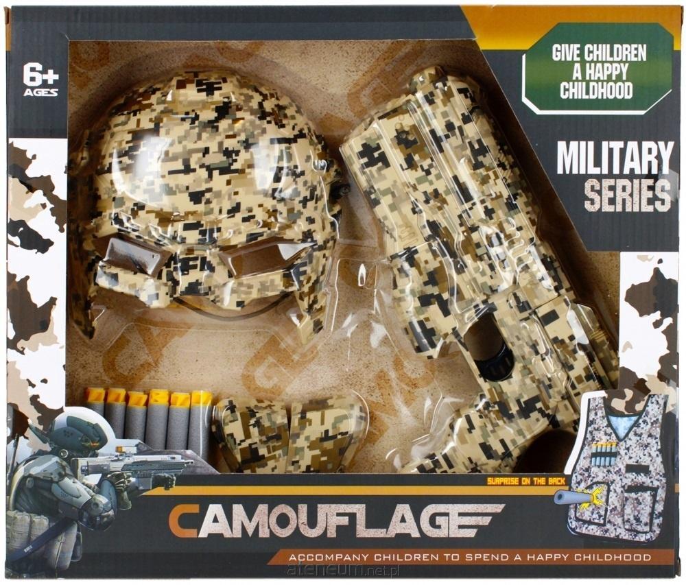Zawartość zestawu: pistolet, zasobnik na naboje, 12 zupełnie bezpiecznych piankowych pocisków, tarcza do ustawienia-powieszenia, maska ochronna. Całość wykonana z plastiku oraz pianki.