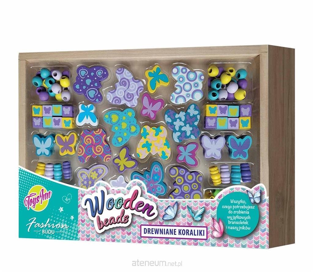 W zestawie znajduje się około 100 sztuk drewnianych koralików o różnych kształtach i wielkości, 10 drewnianych dużych motyli, 14 drewnianych małych kwiatów, około 6 m gumki.