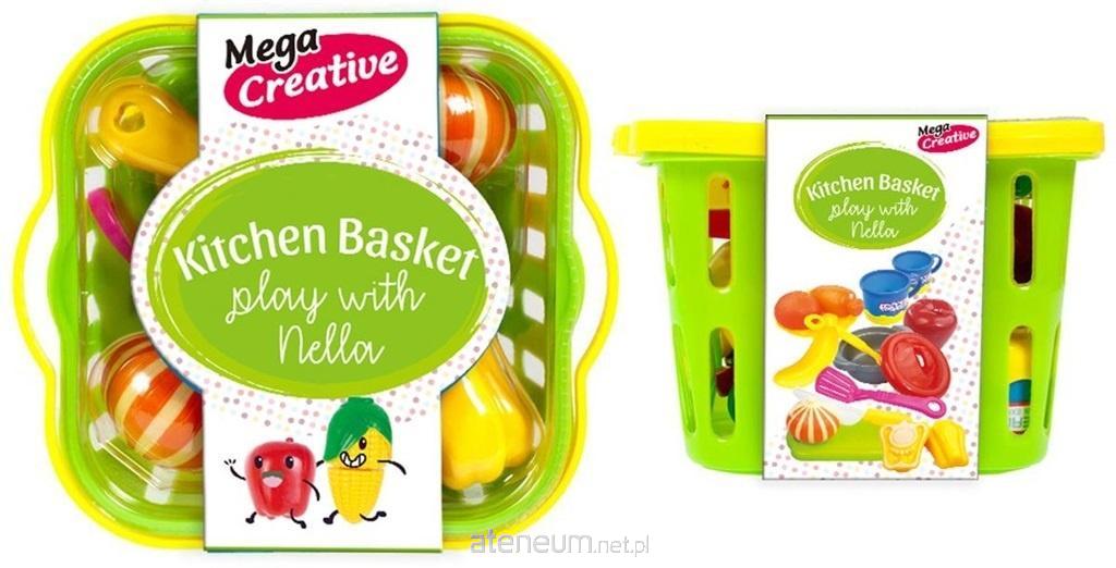 Zawartość zestawu: koszyk, papryka, cebula,jabłko, pomarańcza, marchewka, banan, deska do krojenia, nóż, talerz, 2x kubeczki, garnek, chochelka, łopatka. Całość zapakowana w koszyk.