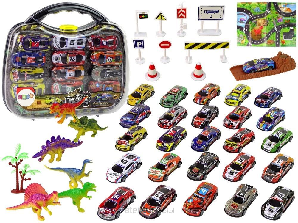 Zestaw Auta Sportowe Resoraki Dinozaury Akcesoria Znaki Drogowe Walizka Sportowe auta i jazda ekstremalna to marzenie małych chłopców, ale także i dużych. Obdarowując kilkulatka zestawem różnokolorowych samochodzików, umożliwiasz chłopcu zabawę w przejażdżki po mieście. Rozbudzisz w nim pasję i zainteresowanie motoryzacją. A może zrealizować wyścig w świecie dinozaurów, pełnym niespodzianek? Wszystkie akcesoria pozwolą stworzyć park z dinozaurami. Autka wykonane są z najmniejszym szczegółem i dokładnością. W zestawie znajduje się 43 elementy, każdy jest indywidualny, w innym kolorze i z różnym wyglądem. Wszystkie autka posiadają napęd pull-back. Wystarczy pociągnąć do tyłu i puścić, a rozwiną niesamowitą prędkość. Plansza z otoczeniem pozwoli w realistyczny sposób wyobrazić sobie miasteczko dinozaurów. Wystarczy rozstawić wszystkie elementy i rozpocząć wyścig! Elementy zestawu: - plansza z otoczeniem - znaki drogowe, drzewa - 6 dinozaurów - 25 sportowych autek Wymiary planszy: 43 cm x 58 cm Średni wymiar autek: 8 cm x 4 cm x 3 cm Wymiary opakowania: 30 cm x 32 cm x 7 cm Zestaw autek przeznaczony jest dla wszystkich dzieciaków powyżej 3. roku życia. Sprawdzi się zarówno jako zestaw dla jednego chłopca, jak i wyposażenie sali zabaw lub przedszkola. Resoraki zostały zapakowane w estetyczne, kolorowe pudełeczko z przeźroczystą witrynką. Zestaw posiada oznakowanie certyfikatem CE, ponadto jego produkcja jest zgodna z normą EN 71.