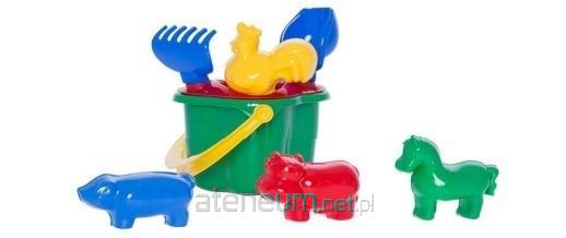 Zestaw zawiera wiaderko "Koniczynka" z sitkiem, łopatkę, grabki oraz 4 foremki w kształcie zwierzątek. Poszczególne elementy są małe i lekkie. Idealne do podróży