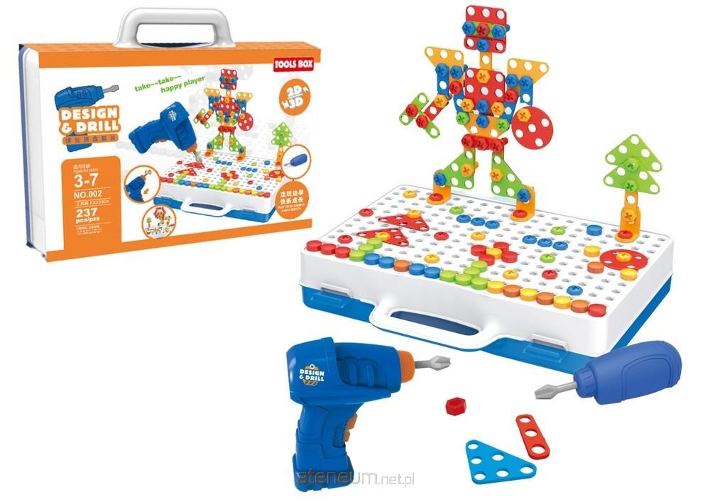 Kreatywna Mozaika Układanka 2D/3D Wkrętarka na baterie + Walizka 248 Elementów Każdy mały konstruktor ucieszy się z zabawki. Pobudzi jego kreatywność i zdolności manualne, a do tego sprawi dużo frajdy. Zabawka poprzez szerokie możliwości tworzenia konstrukcji pochłonie malucha na wiele godzin, a zabawa szybko się nie znudzi ! Dodatkowo uczy cierpliwości i precyzji. Śrubki do przykręcania pozwalają na tworzenie płaskich i trójwymiarowych wzorów. Zestaw składa się z 248 elementów i umożliwia stworzenie nieskończenie wielu wzorów do ułożenia. Za pomocą wiertarki dołączonej do zestawu można wkręcać i odkręcać elementy, tworząc najróżniejsze wzory. Drugim wariantem jest oczywiście śrubokręt, różnokolorowe śrubki i podkładki pozwalają na pobudzenie zmysłu wzroku i zachęcają do zabawy. Układanka pakowana jest wygodną, poręczną walizeczkę z planszą do przykręcania śrubek oraz książeczka z przykładowymi wzorami. Elementy zestawu: - wiertarka na baterie - śrubokręt - śrubki - elementy konstrukcyjne - plansza - walizka Wymiary opakowania: 31 cm x 20 cm x 6 cm Wymiary wiertarki: 15 cm x 15 cm x 5 cm Całość zapakowana jest w praktyczne pudełko. Wiertarka zasilana jest dwoma bateriami 1,5 V AA. Przeznaczona dla dzieci powyżej 3 roku życia. Zgodna z normą EN71 i certyfikatem CE.