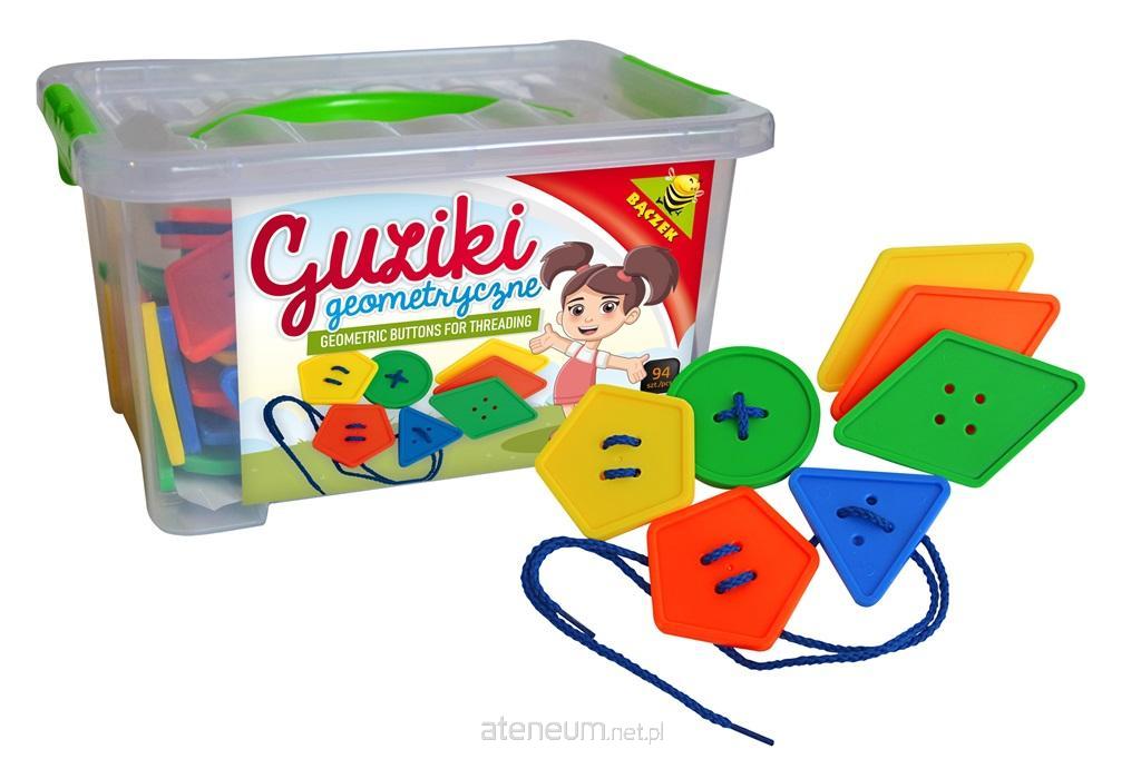 Zestaw kolorowych guzików w kształcie figur geometrycznych zawierający 94 elementy. Dziecko z pomocą guzików uczy się rozpoznawać figury geometryczne takie jak trójkąt, kwadrat, koło, romb, pięciokąt oraz sześciokąt a układając je na płaszczyźnie może tworzyć dowolne obrazy. Dodatkowo w zestawie znajdują się sznureczki na które można nawlekać guziki tworząc przy tym różne kompozycje, przez co dziecko ćwiczy koordynację wzrokowo-ruchową. Zabawka zapewni dziecku treningi umiejętności motorycznych oraz zdolności manualnych. Całość zapakowana w plastikowe zamykane pudełko z rączką, które ułatwi przechowywanie.