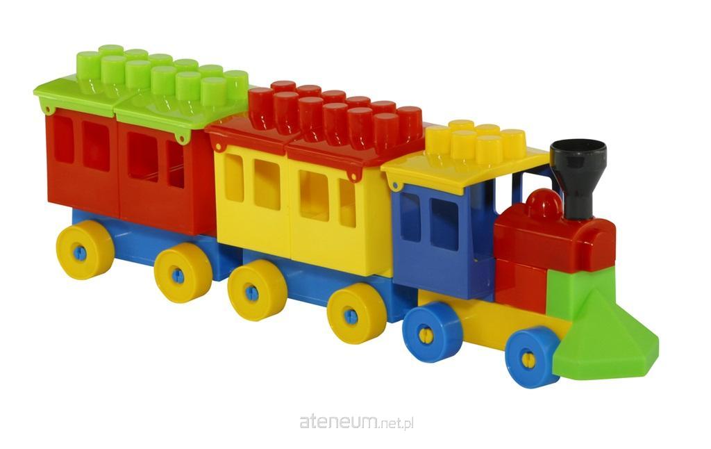 Zabawka przedstawia model pociągu, który został wykonany z klocków. W zestawie znajduje się lokomotywa oraz 2 wagony.