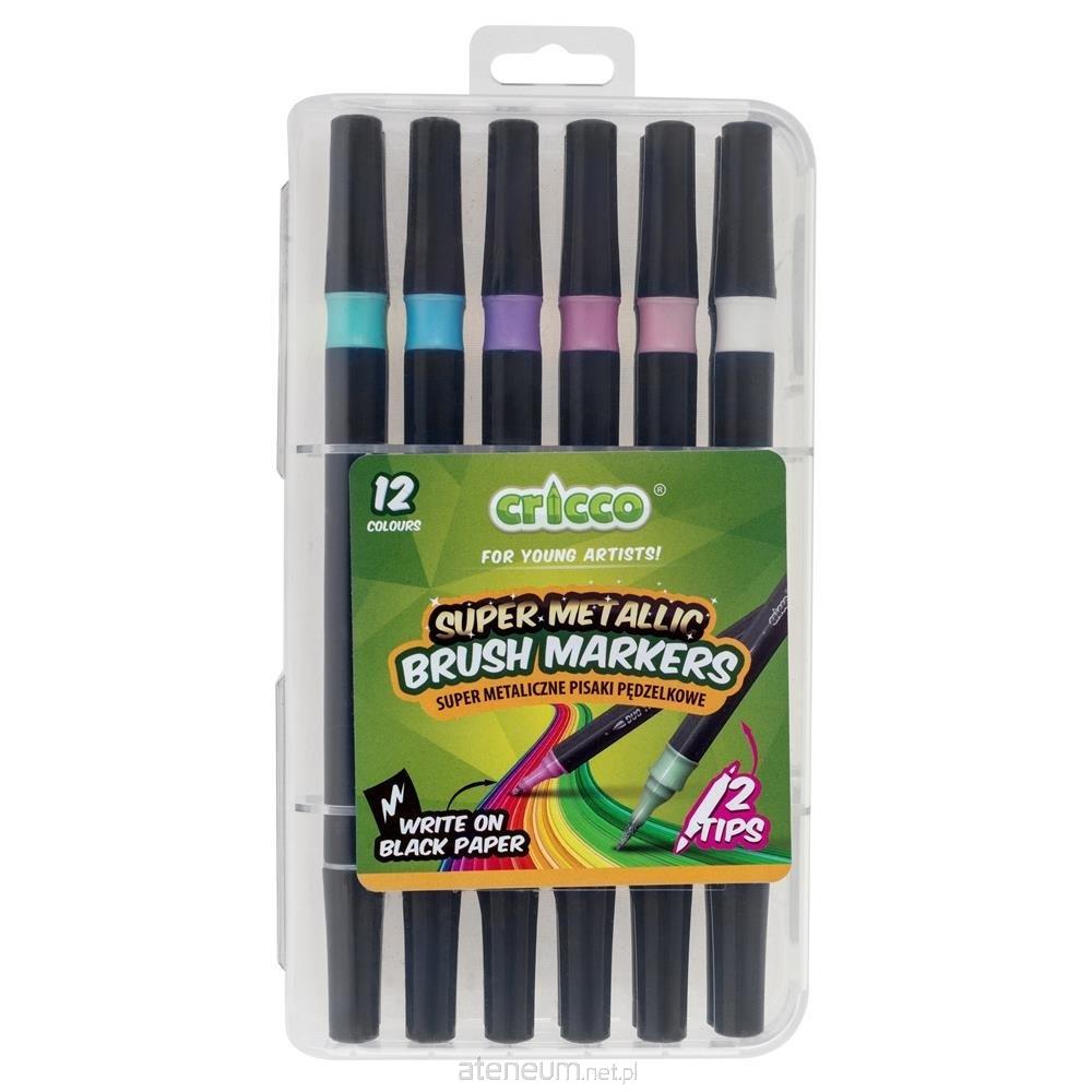 Dwustronne pisaki Cricco z jedną cienką końcówką w formie flamastra oraz drugą, miękką, pędzelkową końcówką. Z syntetycznego włosia, umożliwiającego przyjemne i precyzyjne kolorowanie. Metaliczne, intensywne kolory doskonale nadają się do dekoracji na różnych powierzchniach. Polecane są również do malowania na czarnym papierze. Zestaw 12 kolorów w praktycznej, plastikowej kasecie.