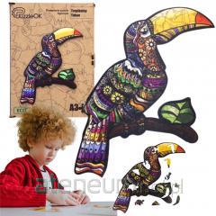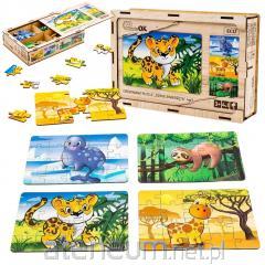 Układanka składa się z elementów o ciekawych i nietypowych kształtach (np. obiekty, organizmy). Gotowa układanka nie będzie miała klasycznego prostokątnego kształtu, natomiast odwzorowywać będzie kształt danego zwierzątka. Przy układaniu warto sugerować się grafiką z pudełka. Wszystkie elementy są zapakowane w drewniane opakowanie, które chroni zawartość. Produkt może być oryginalną ozdobą każdego pokoju.
