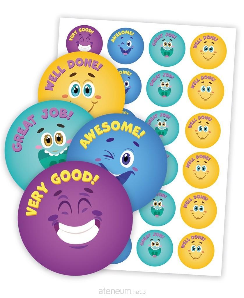 Zestaw 48 naklejek dla uczniów w motywie kolorowych szczęśliwych buziek oraz napisami po angielsku, idealny jako nagroda dla ucznia!