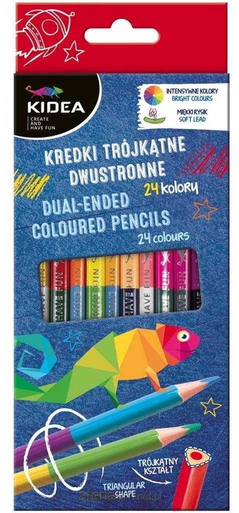 Kredki 2 w 1: jedna kredka - dwa kolory! Zestaw dwunastu kredek w 24 intensywnych kolorach. Dzięki takiemu rozwiązaniu możemy zaoszczędzić miejsce w piórniku i cieszyć się szeroką gamą kolorystyczną. Ergonomiczny, trójkątny kształt kredek ułatwia prawidłowy chwyt i wygodne użytkowanie. Kredki mają miękki rysik, znakomicie kryją, a kolory można swobodnie mieszać.