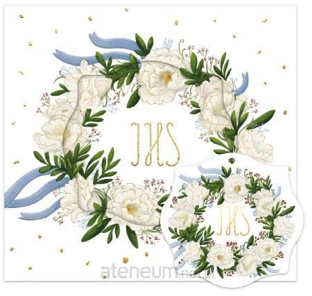 Składany z trzech stron kwadratowy karnet o wymiarach 15 x 15 cm z wyciętym elementem na froncie. Złocony i tłoczony, teksy życzeń w środku. Wydrukowany na wysokiej jakości papierze. W zestawie koperta.
