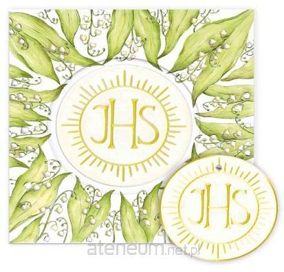 Składany z trzech stron kwadratowy karnet o wymiarach 15 x 15 cm z wyciętym elementem na froncie. Złocony i tłoczony, teksy życzeń w środku. Wydrukowany na wysokiej jakości papierze. W zestawie koperta.