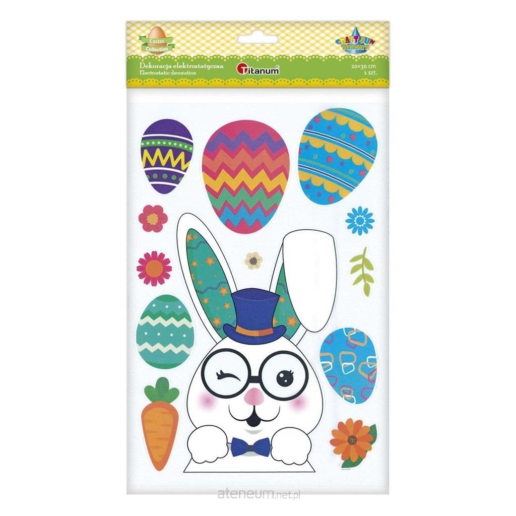Dekoracje bezklejowe, wielokrotnego użytku - można je zdjąć i przykleić ponownie do gładkich powierzchni takich jak szyby, lustra. Przed montażem powierzchnię, na której będzie dekoracja, należy zrosić wodą z kilkoma kroplami płynu do mycia naczyń, najlepiej za pomocą spryskiwacza, usunąć folię ochronną, ułożyć dekorację na docelowej powierzchni, wycisnąć resztki wody spod dekoracji za pomocą płaskiego narzędzia i osuszyć dekorację papierowym ręcznikiem. Wzory: zając w cylindrze i okularach, pisanki, marchewka, kwiaty. 13 sztuk.