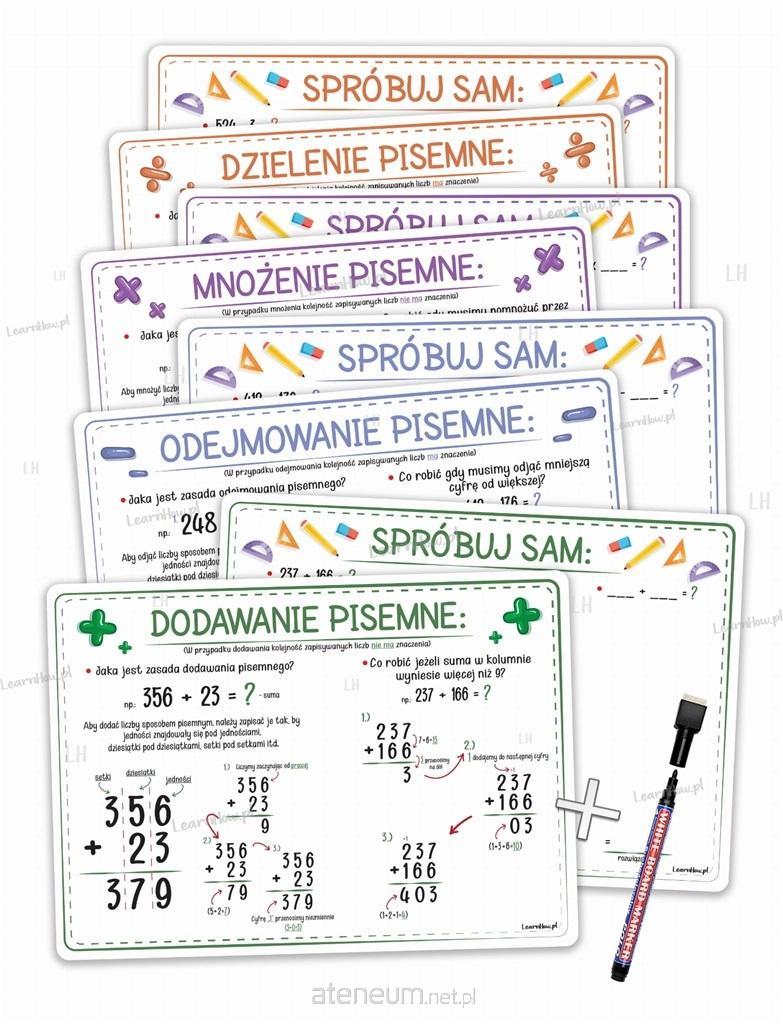 Ten zestaw ułatwi dziecku naukę pisemnego dodawania, odejmowania , mnożenia i dzielenia.