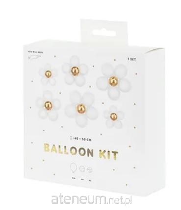 Zestaw balonów lateksowych Kwiaty, zestaw zawiera 6 balonów w kolorze złotym, 30 balony w kolorze białym oraz 4 kółka w rozmiarze 13 cm i 2 kółka w rozmiarze 11 cm do mocowania balonów. Wymiary kwiatów po złożeniu ok. 40 cm, 45 cm, 50 cm.