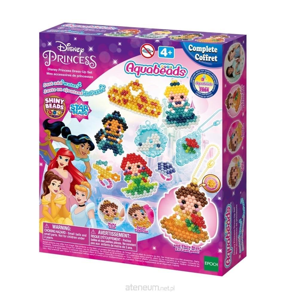 Zestaw do tworzenia biżuterii Aquabeads Księżniczki Disneya zawiera 800 kolorowych koralików, wiele elementów do tworzenia biżuterii, takiej jak broszki, korony, pierścionki, czy fantazyjnych zawieszek do kluczy, podkładkę do układania, spryskiwacz i zestaw arkuszy z szablonami. Produkt przeznaczony dla dzieci od czterech lat.