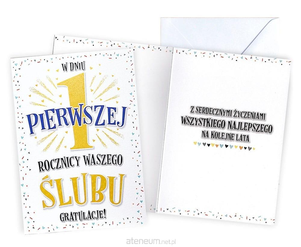 Karnet Vision "W dniu 1 Rocznicy ślubu" V-077. Kartka w powiększonym tzw. Angielskim formacie 140x190 mm. Wykonana z niezwykłą dbałością o szczegóły, zdobiona metalizowaną folią. W środku kartki znajduje się krótki tekst z życzeniami, a pod spodem jest miejsce na własną dedykację. w komplecie: dopasowana kolorystycznie koperta. okazja: Rocznica ślubu
