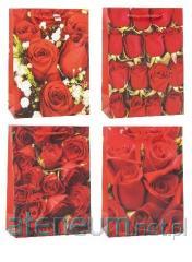Torebka ozdobna, pionowa, o wymiarach 23x18x10 cm. Dostępna w 4 kwiatowych wzorach, na białym tle. Zamiast sznurka znajduje się ozdobna wstążeczka. Posiada wzmacniany spód.