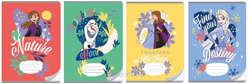 Zeszyt A5, posiada 16 kartek o gramaturze 70 g/m2 w 3 kolorowe linie. Charakteryzuje się estetycznym, lakierowanym wykończeniem i okładką z serii Frozen. Na zewnętrznej stronie okładki: imiennik - miejsce na wpisanie imienia, nazwiska, klasy.