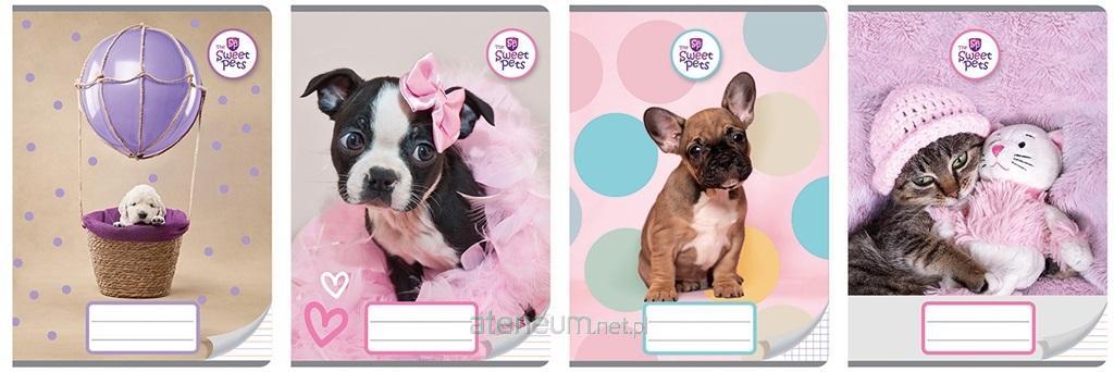 Zeszyt A5, posiada 16 kartek o gramaturze 70 g/m2 w 3 kolorowe linie. Charakteryzuje się estetycznym, lakierowanym wykończeniem i okładką z serii The Sweet Pets. Na zewnętrznej stronie okładki: imiennik - miejsce na wpisanie imienia, nazwiska, klasy.