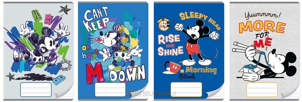 Zeszyt A5, posiada 32 kartki o gramaturze 70 g/m2 w linię. Charakteryzuje się estetycznym, lakierowanym wykończeniem i modną grafiką na okładce z serii Mickey Mouse. Na zewnętrznej stronie okładki: imiennik - miejsce na wpisanie imienia, nazwiska, klasy.
