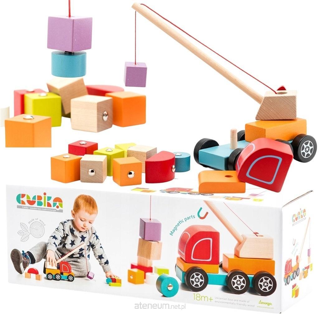 Zabawka Ciężarówka Dźwig to jednocześnie maszyna i prawdziwy zestaw składający się z czternastu elementów - drewnianych kolorowych kostek. Ten zestaw do zabawy może być pierwszym wprowadzeniem Twojego dziecka w świat techniki motoryzacyjnej i budowlanej! Zabawka nie posiada małych części. Dźwig obraca koła, a taką maszyną można toczyć po dowolnej powierzchni. Sam dźwig składa się z czterech elementów. Zestaw zawiera wieżę z dźwigiem magnetycznym, a także dziesięć elementów ładunku.