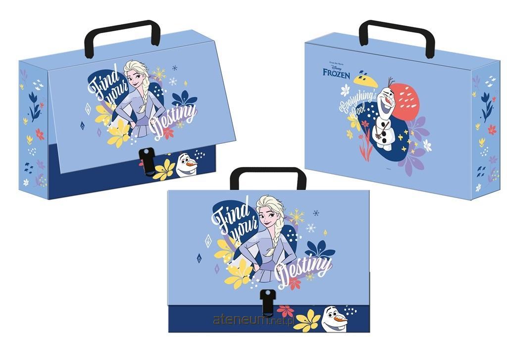 Teczka walizeczka - kartonowa/sztywna teczka z rączką, zapinana plastikowym mechanizmem z przodu. Doskonała dla przechowywania i przenoszenia zeszytów, brulionów, dokumentów, zdjęć, bloków rysunkowych, kredek i wielu innych. Kolorowa na zewnątrz, pokryta połyskową folią, wewnątrz zadruk w jednym kolorze dopasowany kolorystycznie do zewnętrznej części teczki. Motyw z serii Frozen.