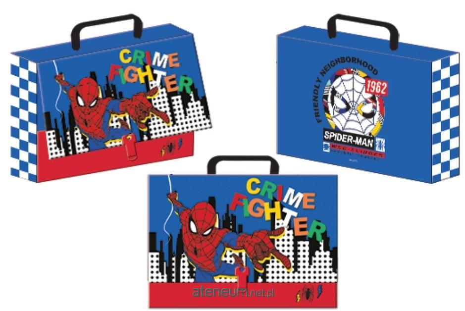 Teczka walizeczka - kartonowa/sztywna teczka z rączką, zapinana plastikowym mechanizmem z przodu. Doskonała dla przechowywania i przenoszenia zeszytów, brulionów, dokumentów, zdjęć, bloków rysunkowych, kredek i wielu innych. Kolorowa na zewnątrz, pokryta połyskową folią, wewnątrz zadruk w jednym kolorze dopasowany kolorystycznie do zewnętrznej części teczki. Motyw z serii Spider Man.
