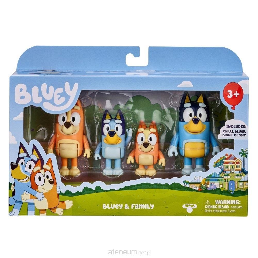 Zestaw figurek z bajki Bluey. Figurki posiadają punkty artykulacji w rękach oraz w pasie. Zestaw zawiera 4 figurki (Bluey, Bingo, Chilli, Bandit).