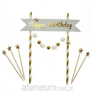 Dekoracja tortu Happy Birthday - pomponiki, 1 komplet w złotym kolorze
