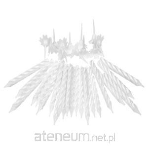 Białe świeczki urodzinowe z podstawkami do dekoracji tortu. Wysokość świeczki 6 cm. Opakowanie zawiera 24 świeczki i 12 podstawek.