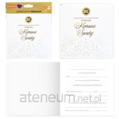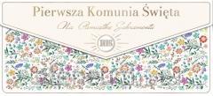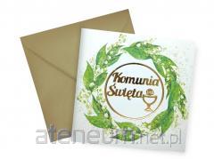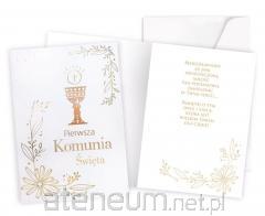 "Kartka okolicznościowa z okazji Pierwszej Komunii Świętej o treści: W uroczystym dniu pierwszej Komunii Świętej życzymy Ci obfitych Łask Bożych, a Sakrament Eucharystii niech umacnia w Tobie wiarę , nadzieję i miłość."