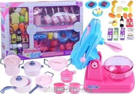 Duży zestaw dla małej pomocy kuchennej Przedstawiony zestaw składa się z pełnego wyposażenia kuchni wykonanego z wysokogatunkowego tworzywa, jakim jest certyfikowany plastik - pozwala to na łatwe czyszczenie i utrzymanie wysokiego poziomu higieny płynącego z korzystania z zabawek. Przyjemne dla oka kolory i dokładne odwzorowanie realnych przedmiotów tylko zachęcają do rozpoczęcia zabawy, stymulując wzrok malucha. Korzystając z tego kompletu, dziewczynki mogą w przyjemny sposób naśladować swoich rodziców, którzy gotują obiady i przyrządzają przesłodkie desery. Zabawkowa kuchnia działa na wyobraźnię dziecka, równocześnie rozwijając jego kreatywność i zdolności manualne. Przemyć do pokoju dziecięcego zabawki imitujące realne przybory i sprzęty kuchenne, a Wasza przygoda dopiero się rozpocznie! Ten zestaw kuchenny składa się z dużej liczby akcesoriów oraz produktów spożywczych, co tylko czyni zabawę lepszą. Wybierając go, możesz mieć pewność, że Twoja pociecha będzie szczęśliwa. Mikser z dołączoną misą jest zabawką, która prawdopodobnie zwróci największą uwagę dziecka. Poruszając różową dźwignią, można w prosty sposób wprawić w ruch ubijaczki do piany. To doskonała możliwość pomagająca zrozumieć małym pomocnikom kuchennym działanie poszczególnych sprzętów. W zestawie małej pomocy kuchennej Twoja pociecha znajdzie: - zestaw różowych garnków i patelni z pokrywkami - 7 sztuk, - mikser, - dwa talerzyki z ciastem, - dwie filiżanki, - przyprawy, - artykuły spożywcze: muffinkę, jajko, rogalika, chałkę, tosta, ser, kukurydzę, brokuła, marchewkę, dynię, ziemniaka, udko z kurczaka, mleko, mleko czekoladowe, wino, przetwory pomidorowe, kartonik cukierków, soku jabłkowego i dwóch o smaku czarnej jagody. Taki zasób akcesoriów pozwoli dziecku na długą zabawę, która z pewnością nie będzie się nudzić. Możecie wspólnie gotować, używając garnków i patelni, a także serwować śniadania czy słodkie podwieczorki. A co powiecie na zabawę w restaurację? Myślimy, że mnogość zabaw z wykorzystaniem plastikowej kuchni ogranicza tylko wyobraźnia dziecka. Warto pamiętać, że ze względu na małe wymiary produktów, zestaw kuchenny przeznaczony jest dla dzieci, które ukończyły trzeci rok życia. Wymiary wybranych elementów: - mikser z misą: 13,5 cm x 15 cm, - filiżanki z uszkami: 5 cm x 8 cm, - największy garnek: 6,5 cm x 12 cm, - patelnia: 17 cm x 3,5 cm, - talerzyk: 10,5 cm, - kartonik soku: 12 cm x 4 cm, - tost: 8 cm x 6 cm, - kukurydza: 9 cm x 3,5 cm, - wino: 11,5 cm x 4,5 cm. Wymiary opakowania: - 45 cm x 67,5 cm x 11 cm.