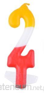 Świeczka urodzinowa w kształcie cyferki wykonana z trójkolorowego wosku: czerwonego, białego i żółtego. Wysokość świeczki 10,5 cm.