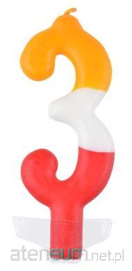 Świeczka urodzinowa w kształcie cyferki wykonana z trójkolorowego wosku: czerwonego, białego i żółtego. Wysokość świeczki 10,5 cm.