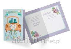 Karnet z kieszonką na pieniądze w formacie B6, składany w poziomie. Złocony i tłoczony, teksy życzeń w środku. Wydrukowany na wysokiej jakości papierze. W zestawie koperta.