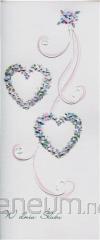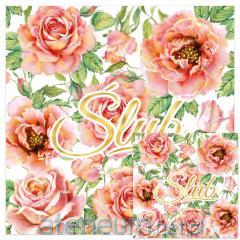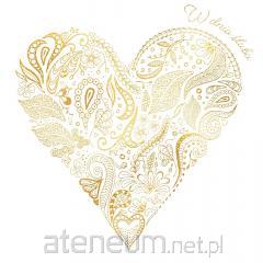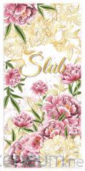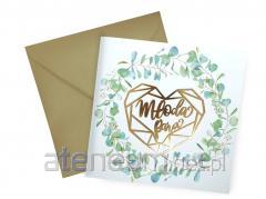 Składany z trzech stron kwadratowy karnet o wymiarach 15 x 15 cm. Złocony i tłoczony, teksy życzeń w środku. Wydrukowany na wysokiej jakości papierze. W zestawie koperta.