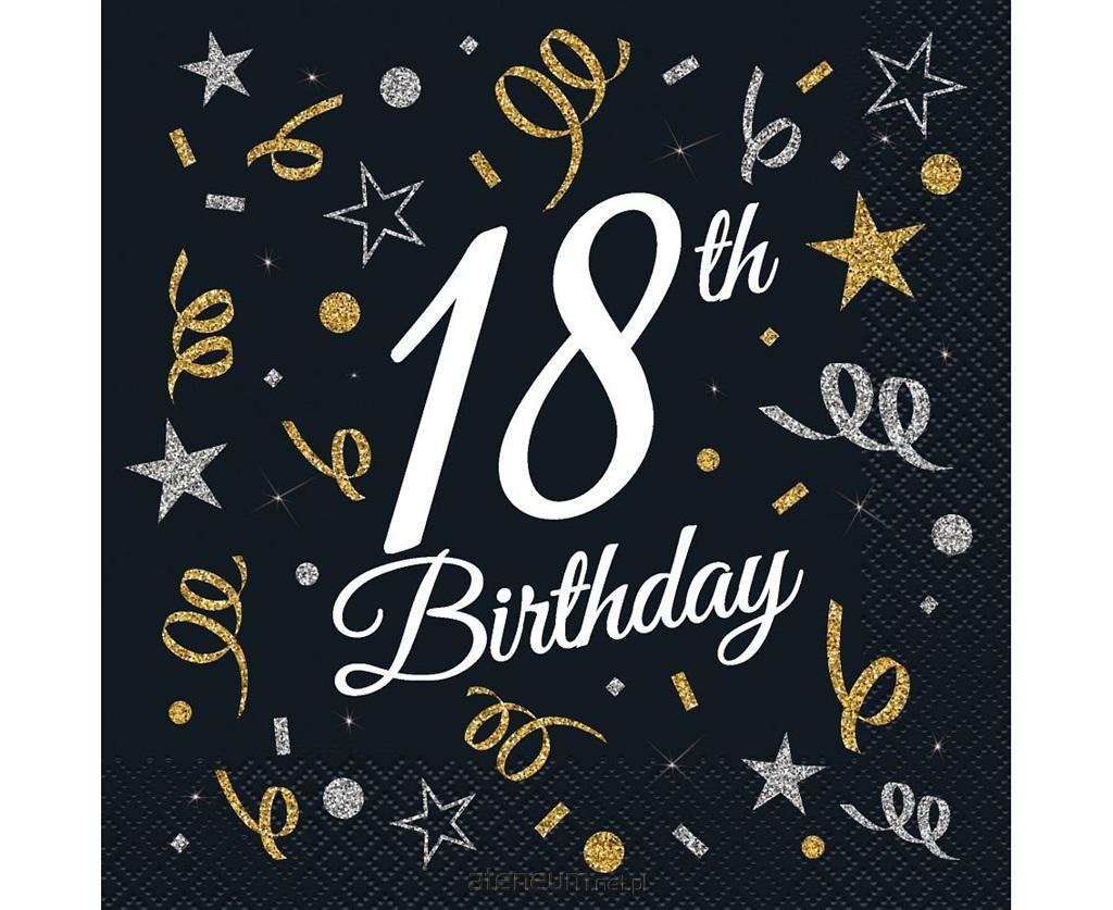 SERWETKI PAPIEROWE 18 URODZINY Wymiary: 33 x 33 cm Kolor: Czarny Nadruk:18th Birthday gwiazdki, konfetti Materiał: papier Ilość sztuk w opakowaniu: 20
