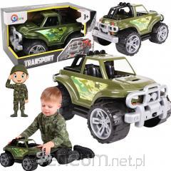 Pojazd jeep z oponami terenowymi. Auto na napęd cierny, omija przeszkody. Obraca się o 360 stopni. Produkt występuje w kilku wersjach kolorystycznych, wybierany losowo. Cena dotyczy jednej sztuki. Zabawka zapakowana w kartonową podstawkę z przezroczystym kloszem. Zabawka dla dzieci od 3 lat. Podane wymiary są wymiarami opakowania.